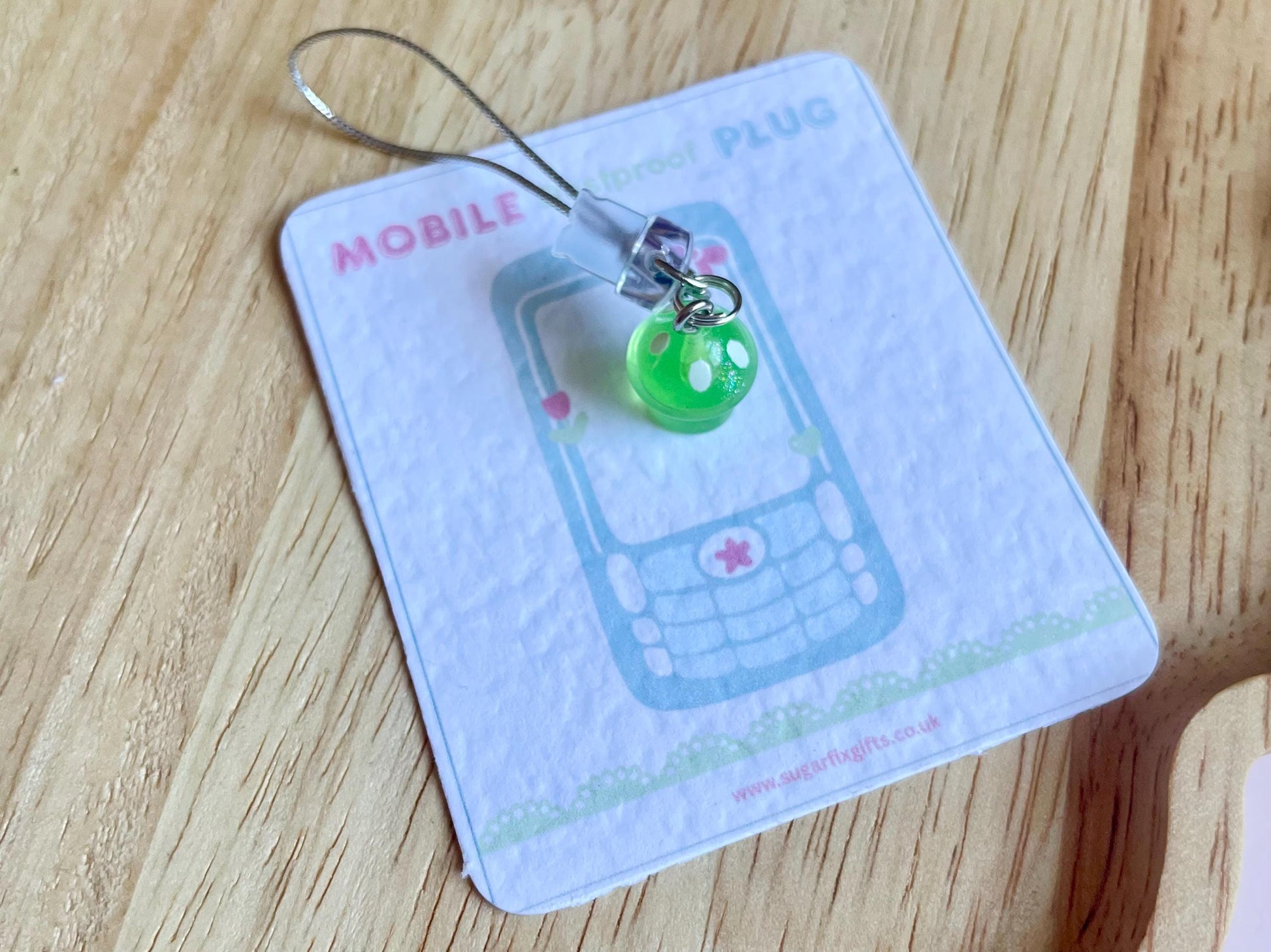 2-in-1 Toadstool 🍄 charm dust plug for Kindles, Phones, Tablets - made from resin and has a handy charm strap to attach to the device.