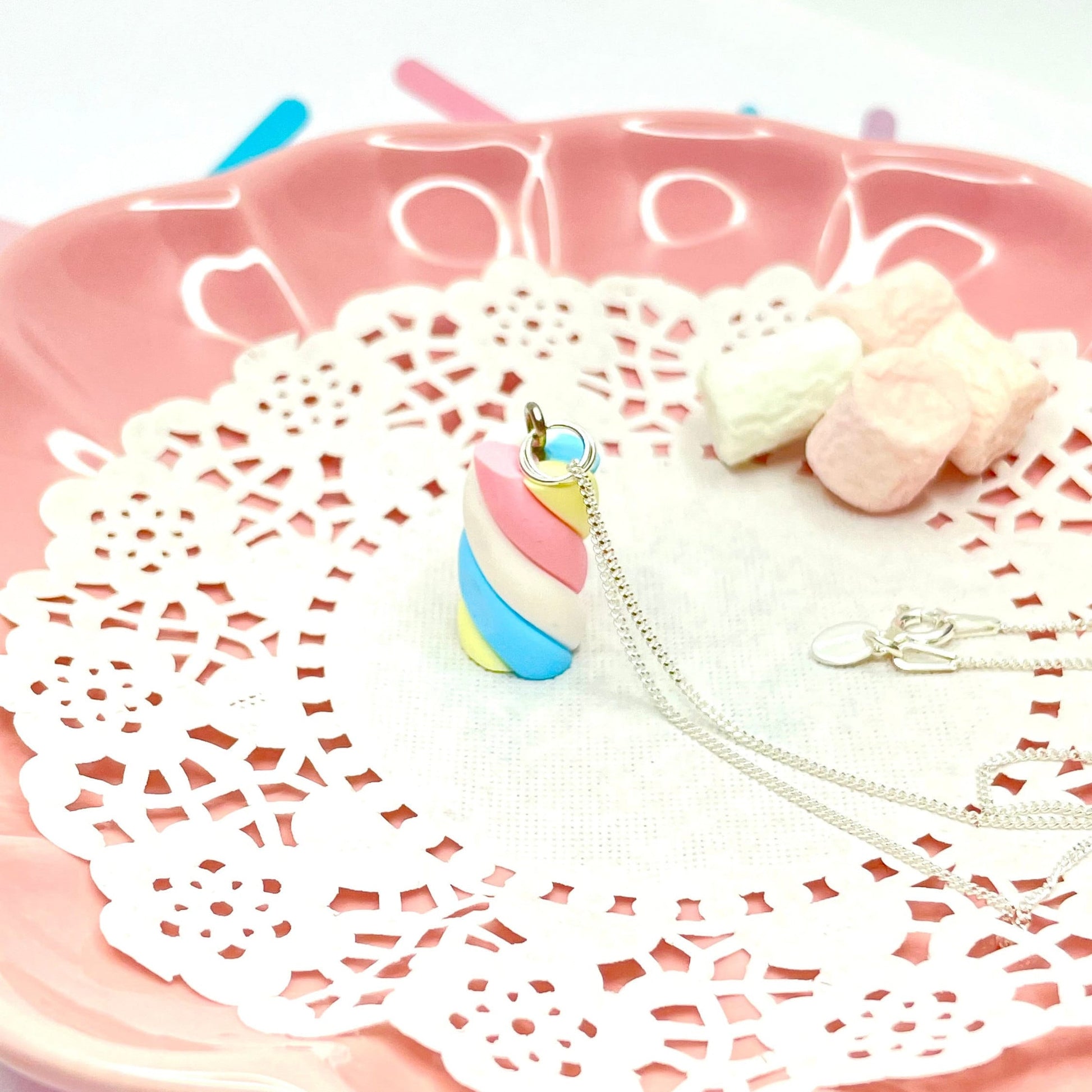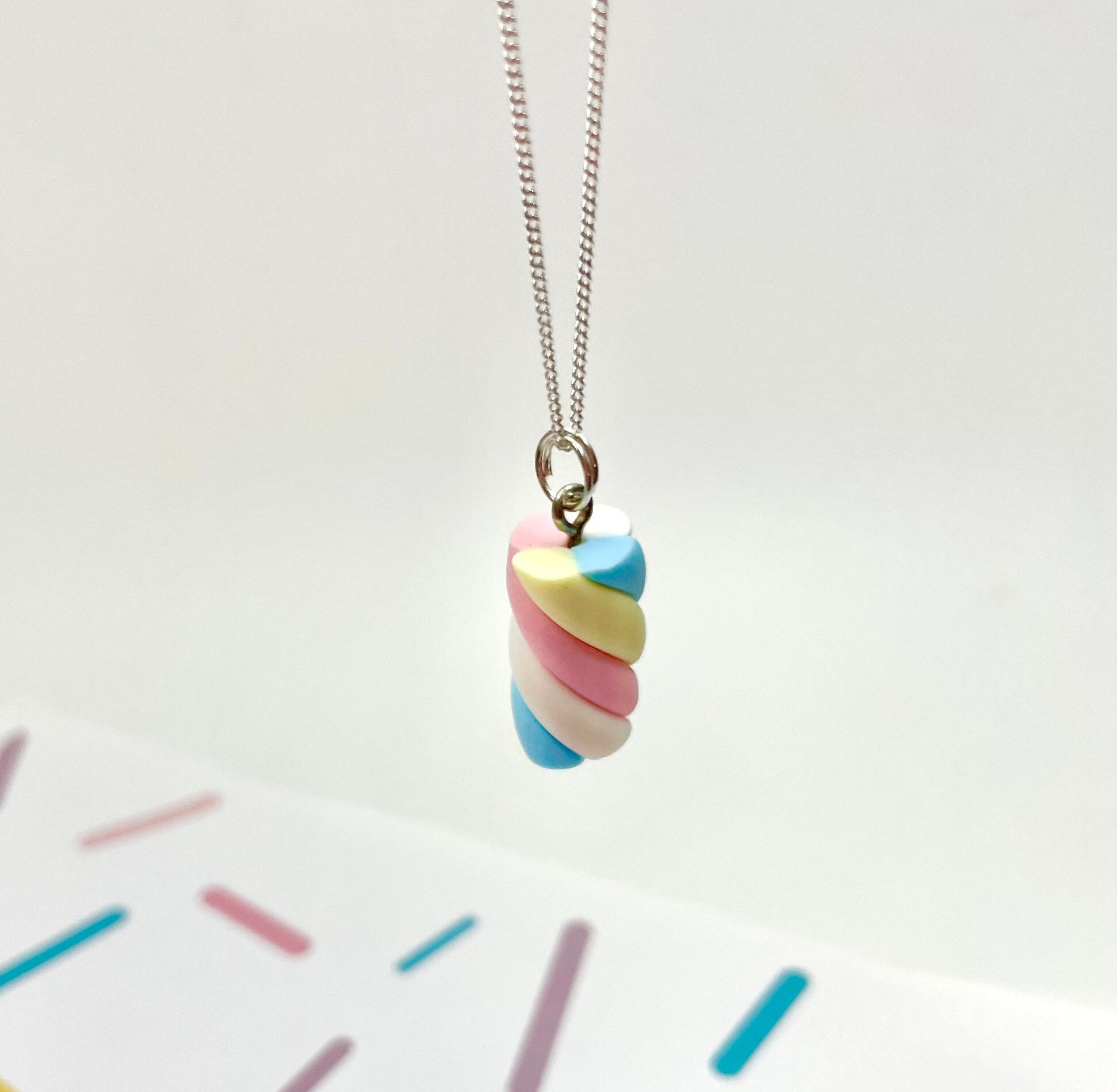 Small Pastel Marshmallow Flump Charm Pendant Necklace - Handmade with polymer clay. Beautiful pastel colours of soft lemon, baby pink and blue. So cute and delicate and a perfect gift for any marshmallow lover - how realistic is that? Hung on a 925 Sterling silver curb chain with a Sterling silver extender chain on various lengths.