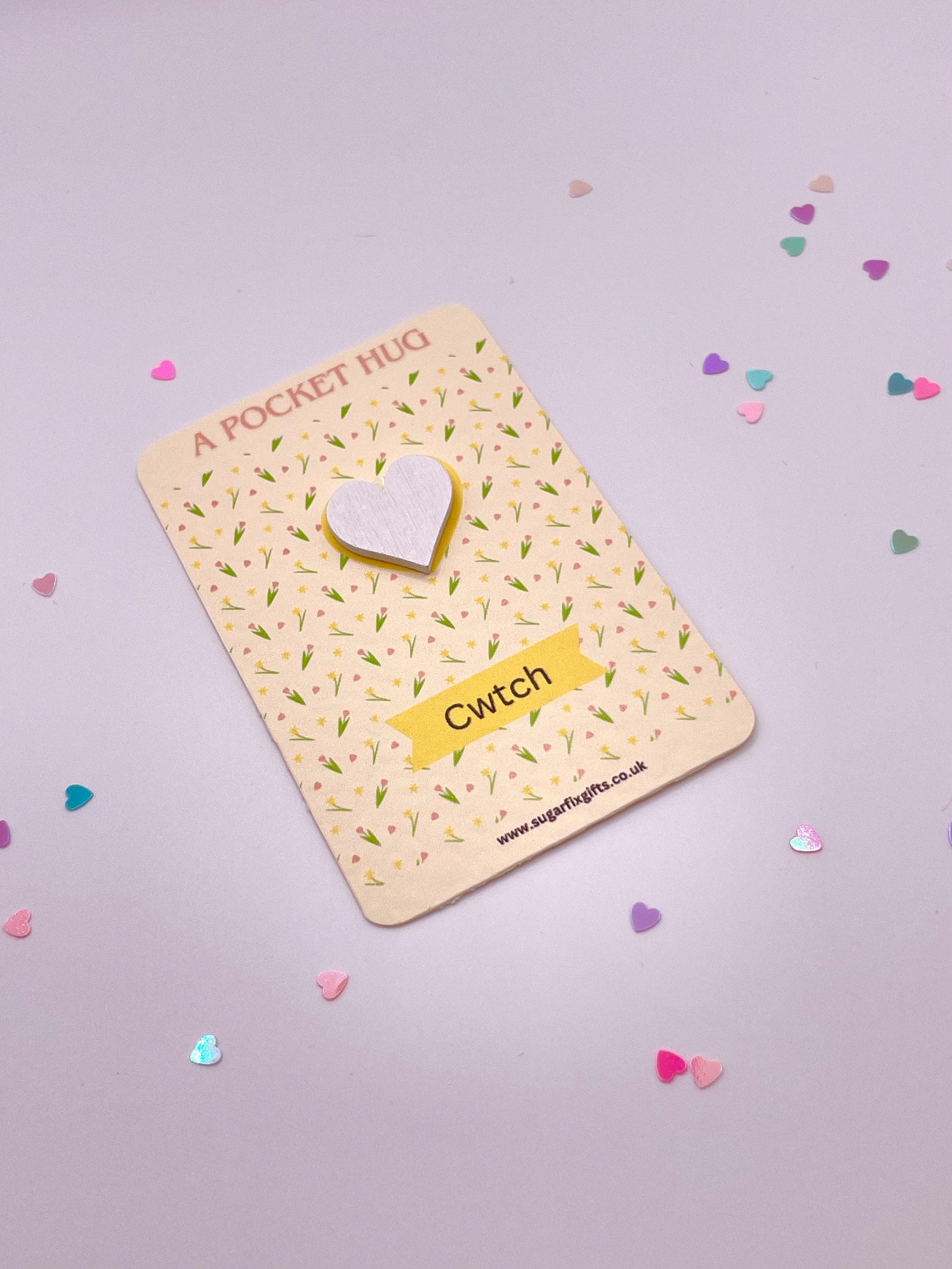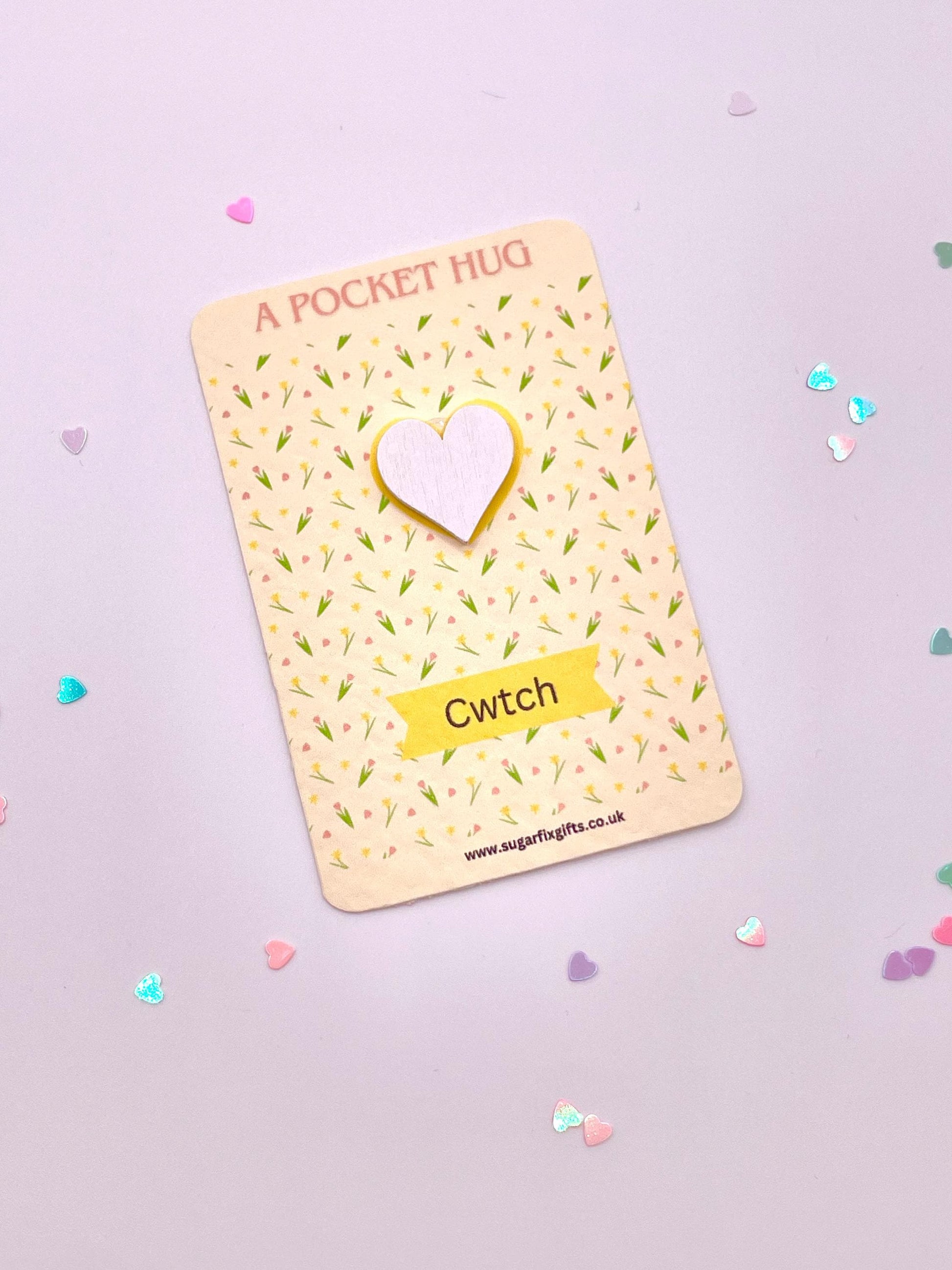 This Welsh inspired pocket hug with a daffodil and tulip background and Cwtch which means Hug in Welsh with a white wooden heart - Perfect as a keepsake token gift or slip into a greetings card.