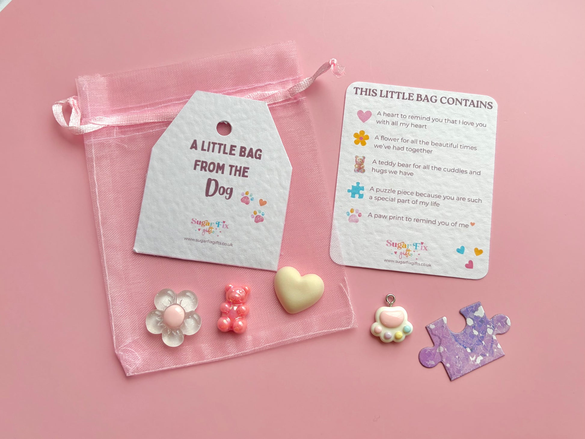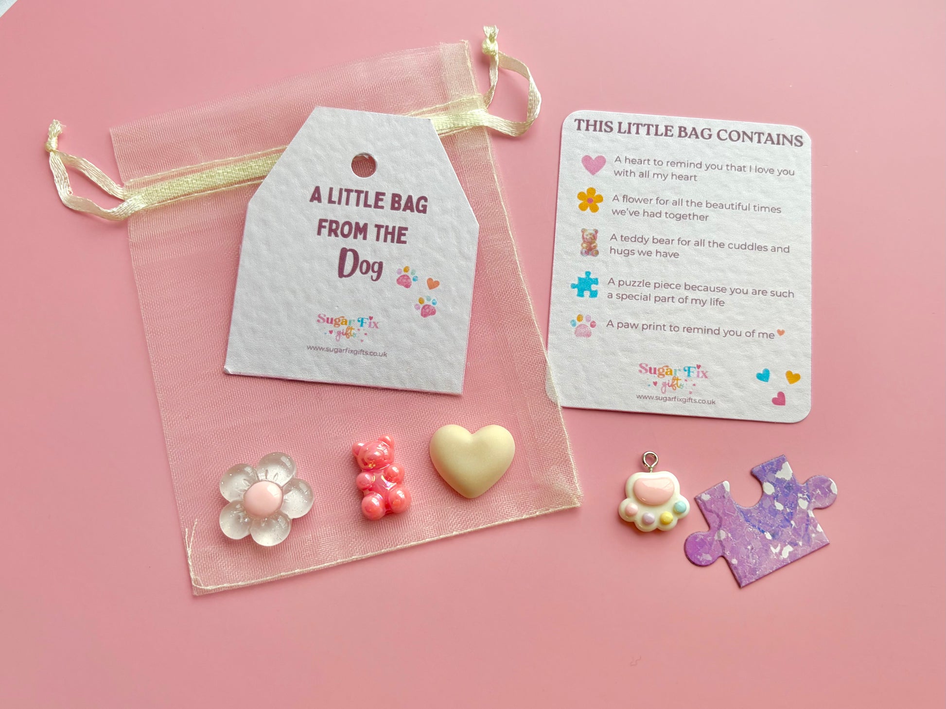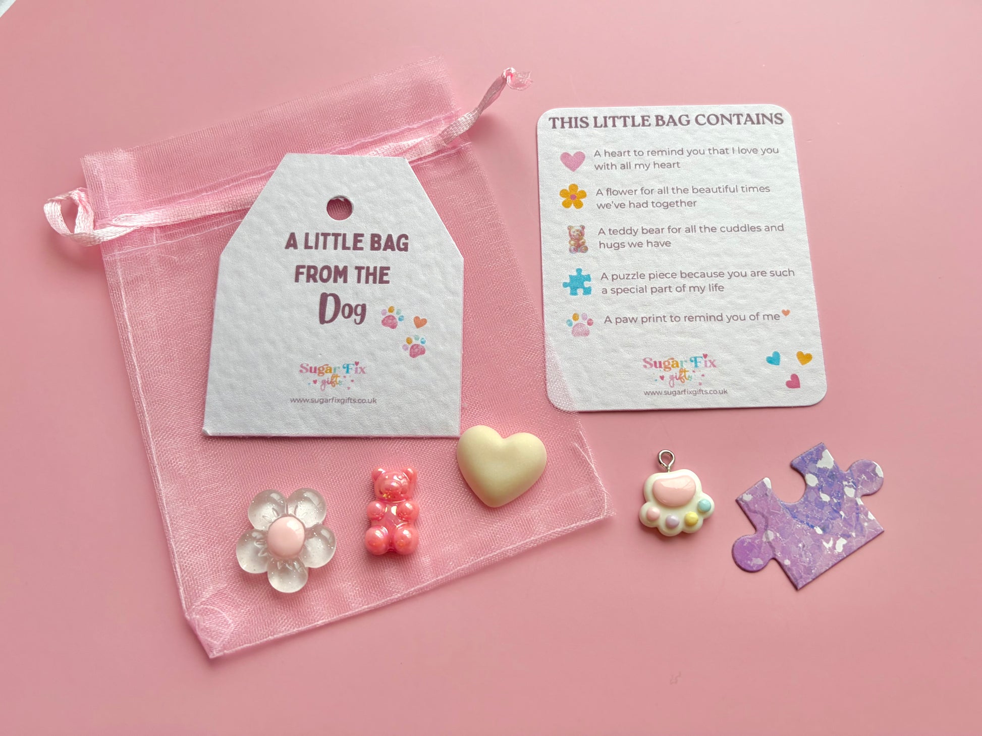 A little ivory or pink organza bag full of thoughtful loving sentiments making it a perfect gift to show how much she or he means to the Dog. It’s a little gift much like the pocket hug.
