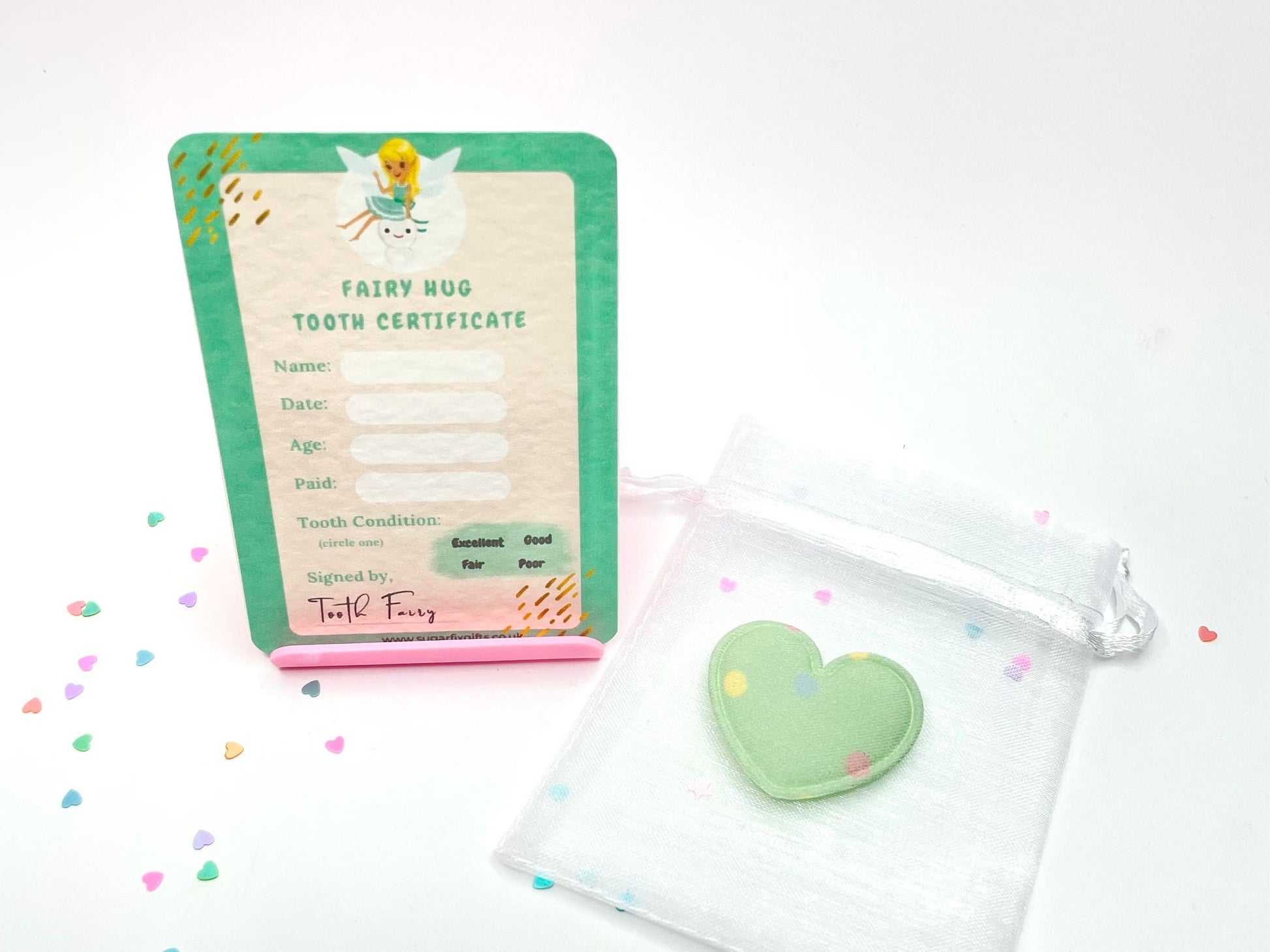 Treat the little one in your life when they lose each tooth with my Tooth Fairy Certificate Pocket Hug Gift Set - green backing card where you can add the child’s name, Date the tooth came out, Age of the child, how much the Tooth Fairy paid and you can circle the condition of the tooth to keep them interested in looking after their teeth. There’s a little white organza bag with a green padded heart that the Tooth Fairy left - such a lovely keepsake idea.