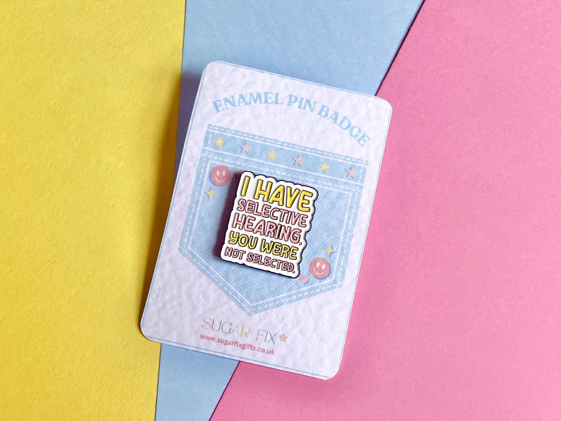 Pastel “I Have Selective Hearing - You Were Not Selected” Fun Slogan Fun Pin Badge - perfect gift for your fun friend - just a thoughtful gift or maybe a little adornment for your own jacket - presented on a lovely sentiment backing card and an organza bag is included.