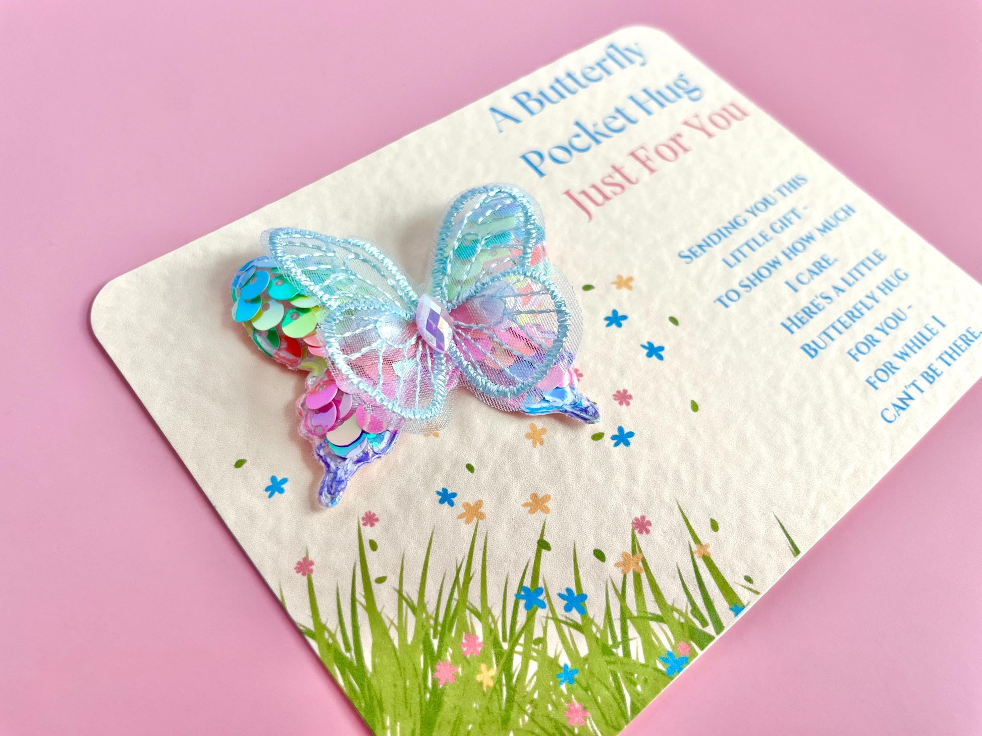 Butterfly Pocket Hug Gift - Multicoloured Sequin Fabric Butterfly with blue wings Pocket Hug - Perfect little Birthday Letter Box Gift! This is a much larger size Butterfly and backing card. Beautifully colourful and a lovely sentiment gift.