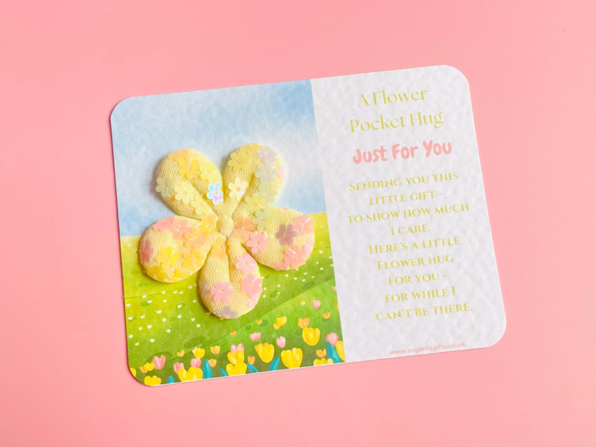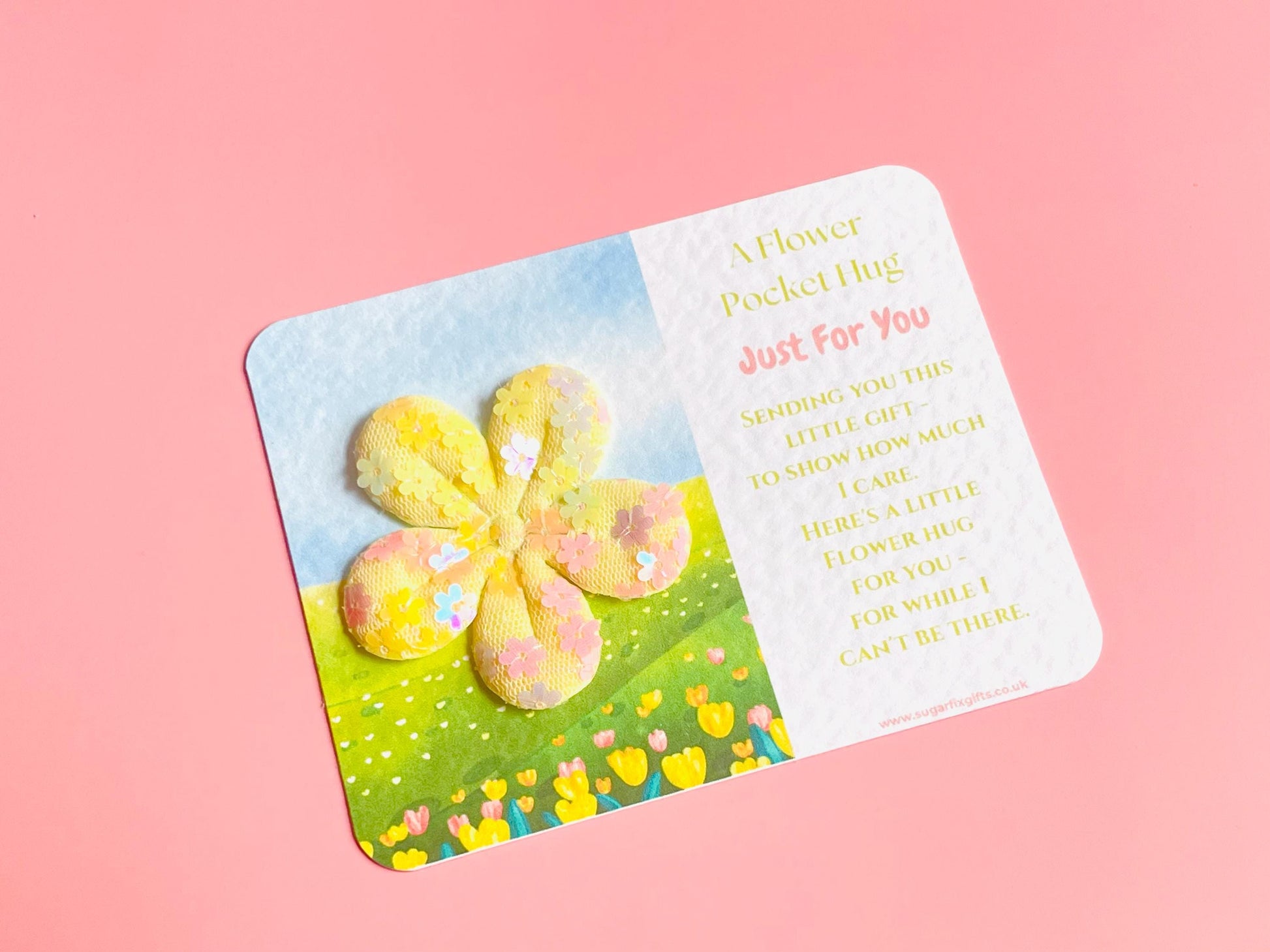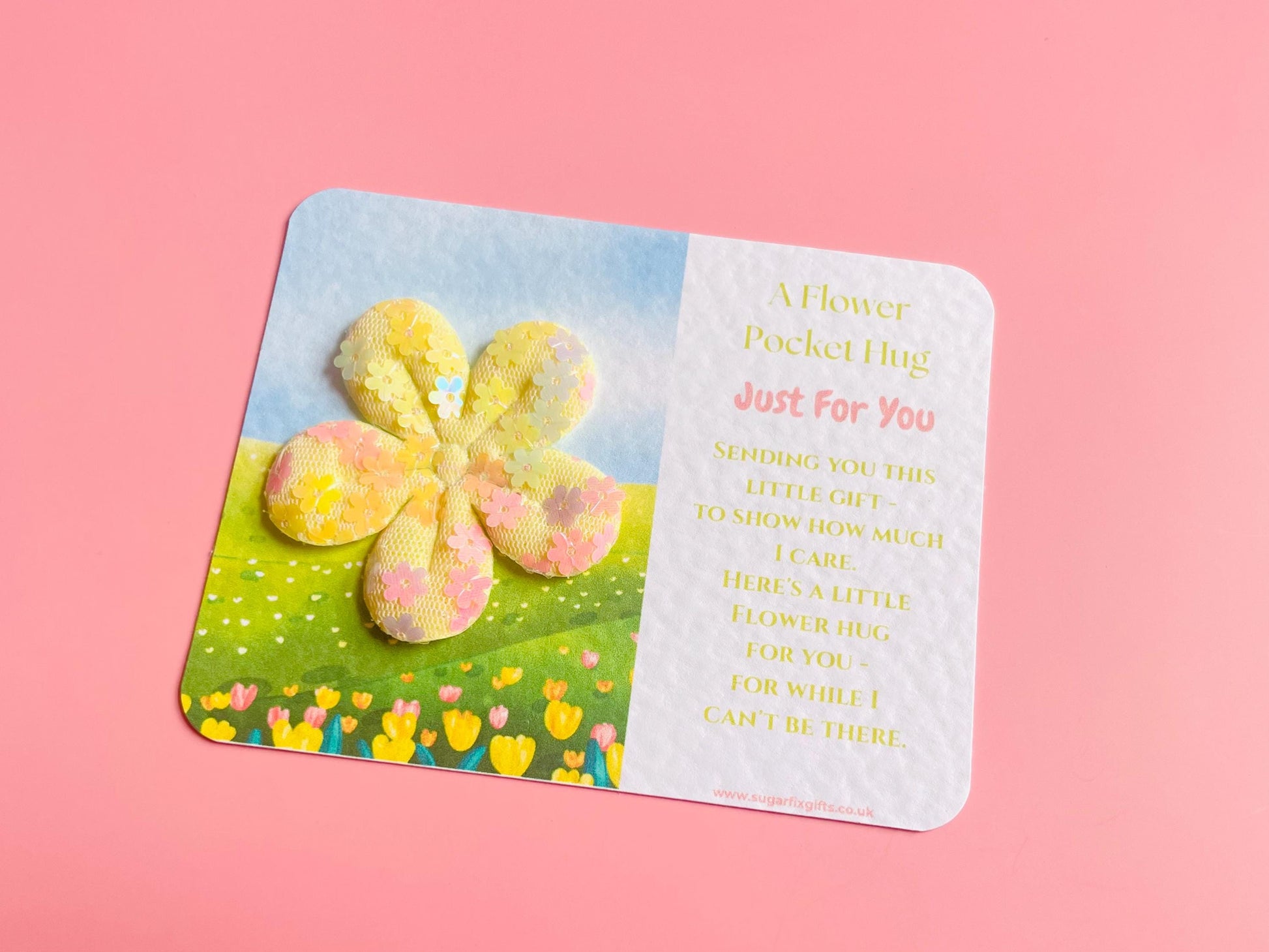 Flower Pocket Hug Gift which says Just For You with a sentimental verse and Glittery Sunny Yellow Sequin Fabric Flower Pocket Hug - Perfect thoughtful Gift to show someone you care!