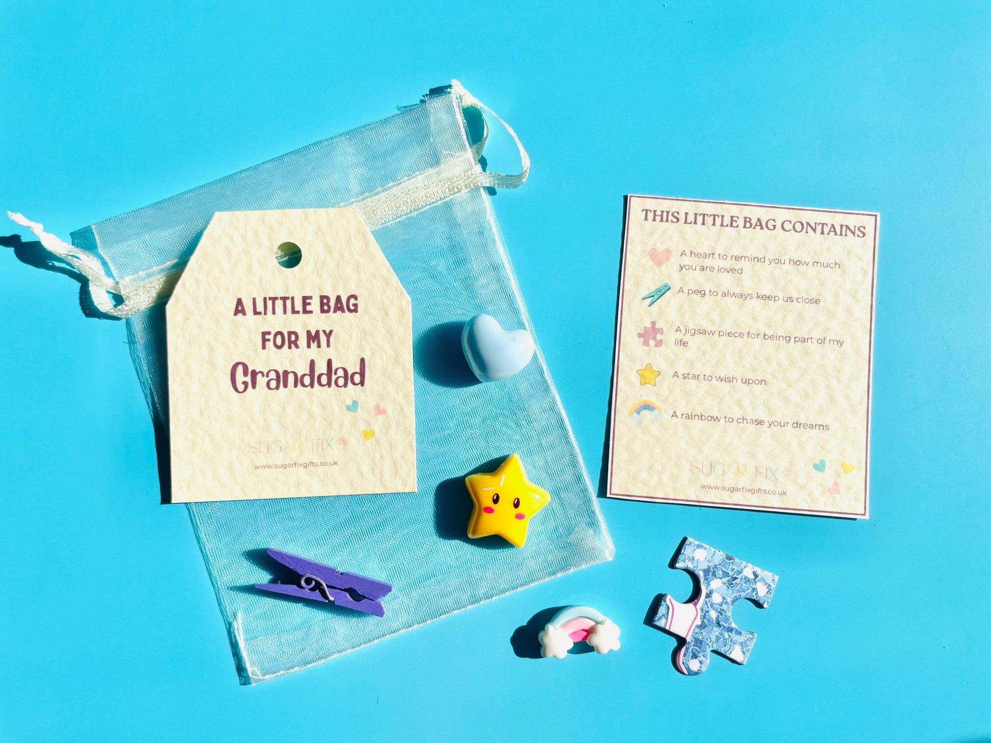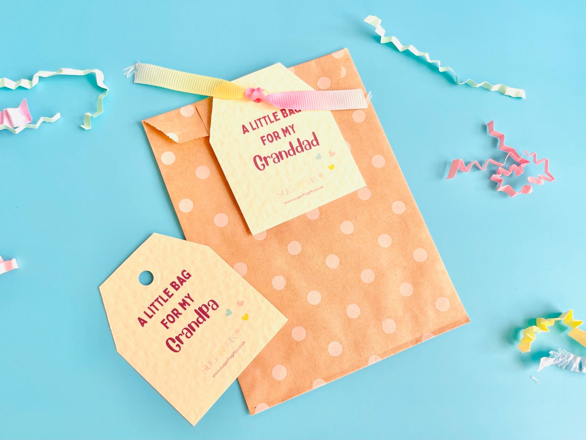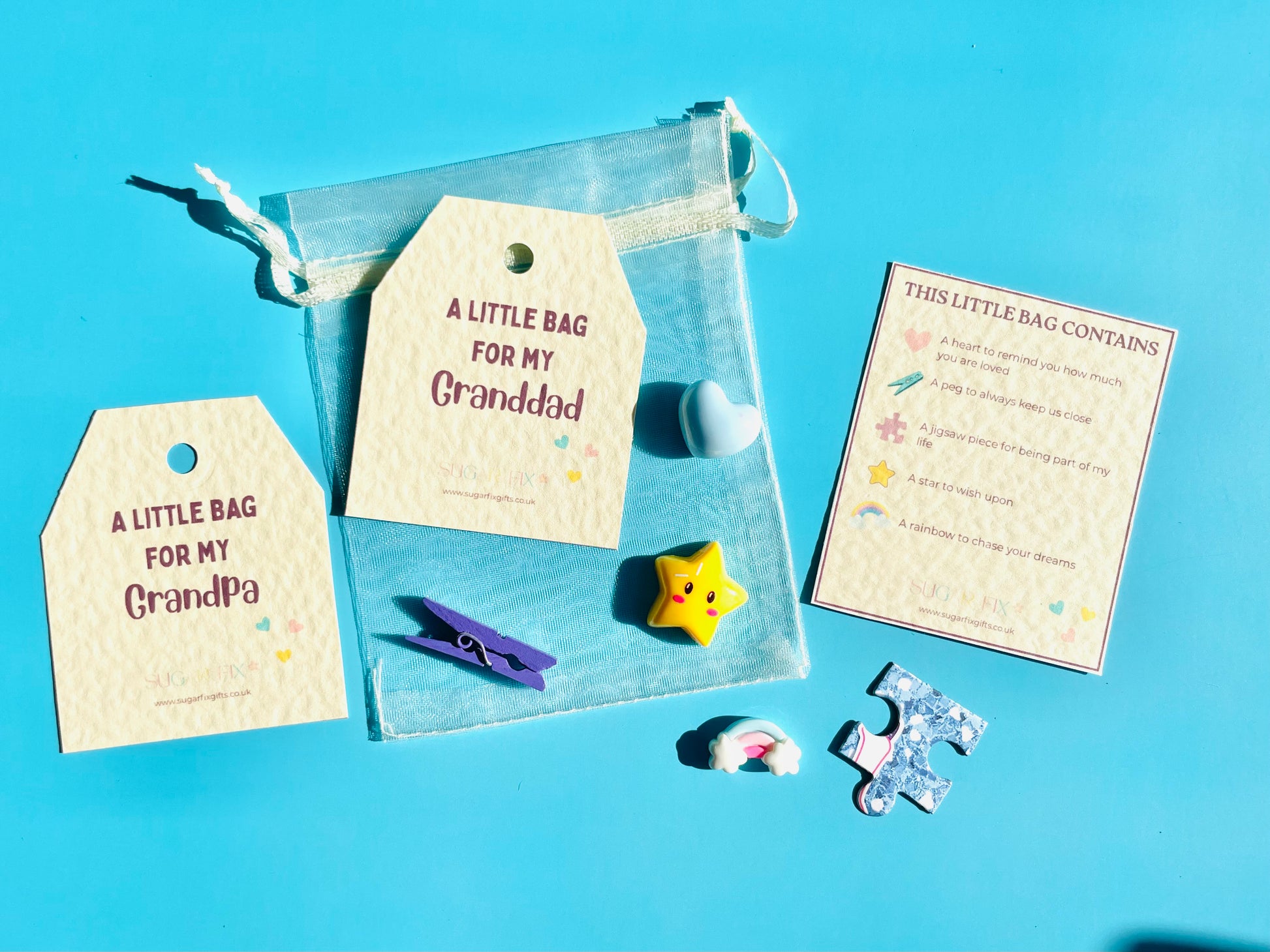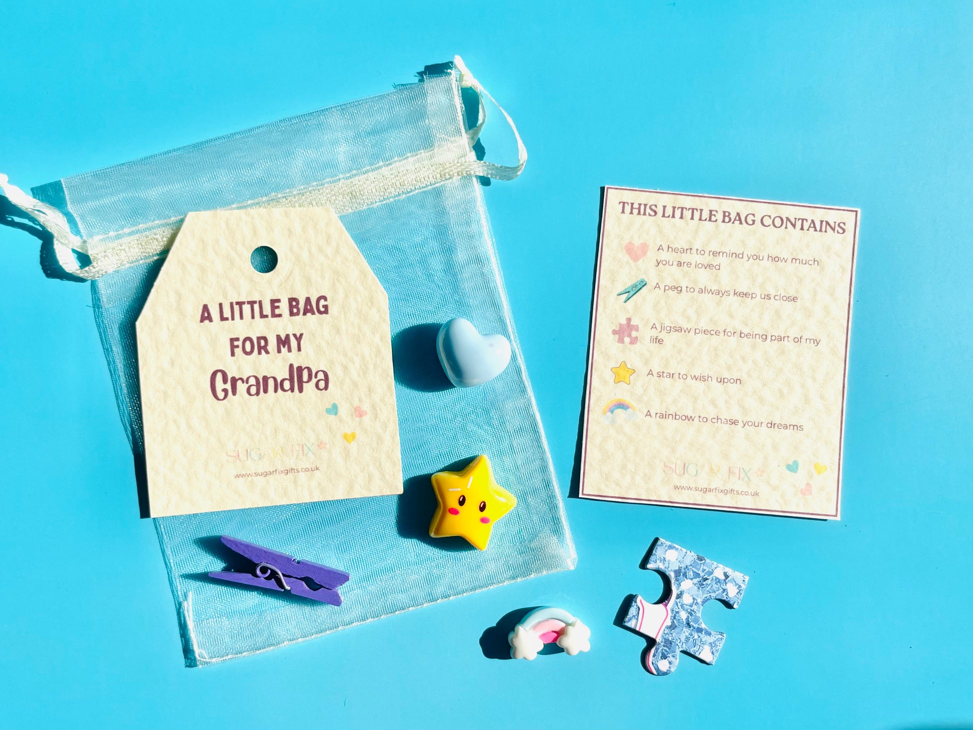 Can be used as an alternative to a greetings card and arrives in a coordinating gift bag with a “Little bag for Granddad or Grandpa” gift tag and a Free message can be added to the card, delivered in a letterbox friendly white box.