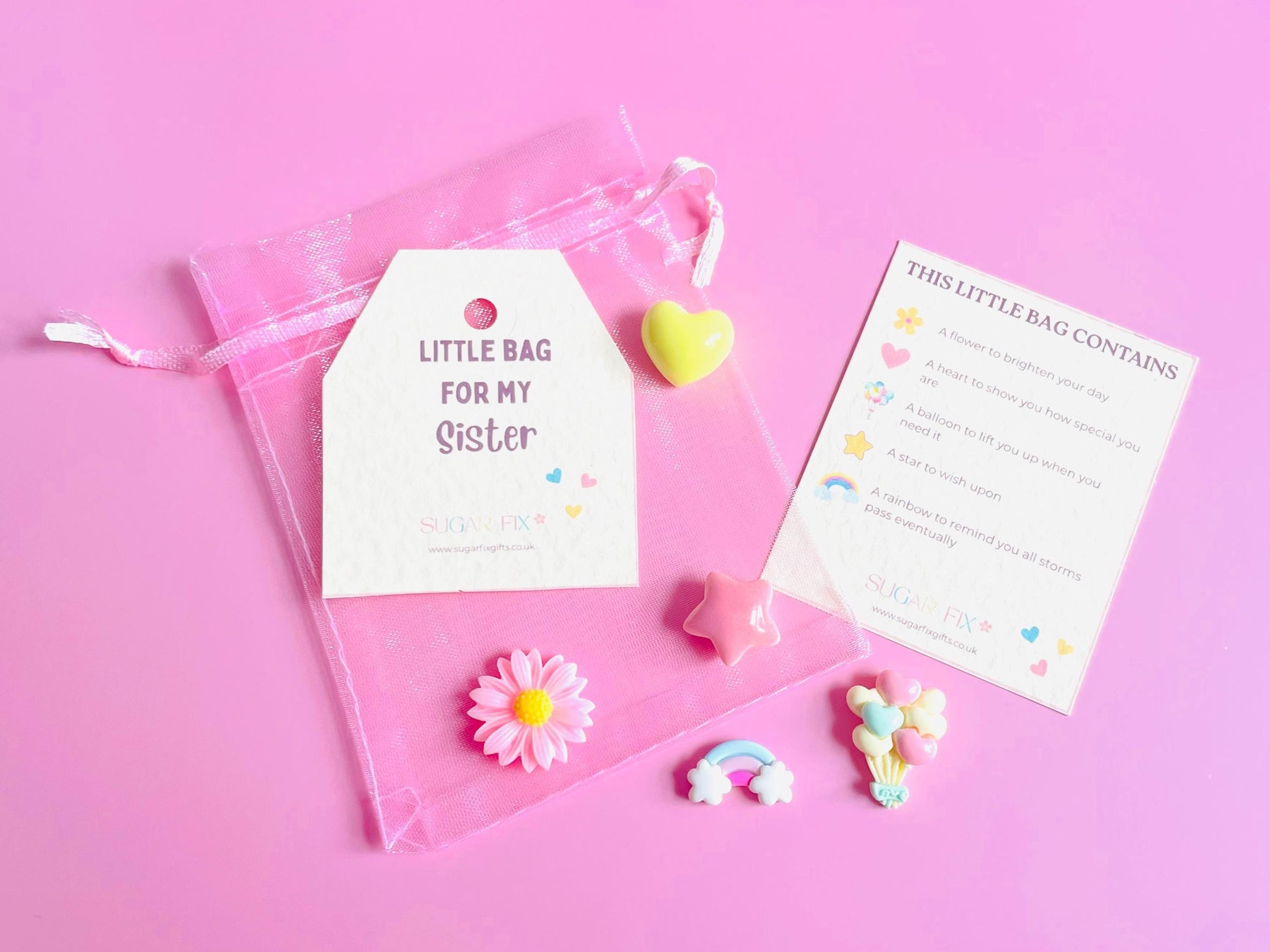 Can be used as an alternative to a greetings card and arrives in a coordinating gift bag with a “Little bag for my Sister” gift tag and a Free message can be added to the card, delivered in a letterbox friendly white box.