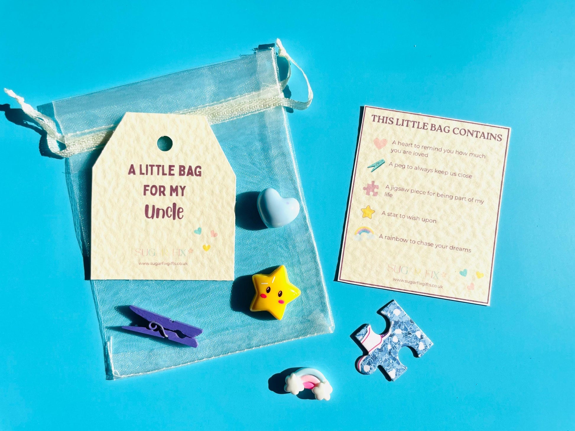 Can be used as an alternative to a greetings card and arrives in a coordinating gift bag with a “Little bag for Uncle” gift tag and a Free message can be added to the card, delivered in a letterbox friendly white box.