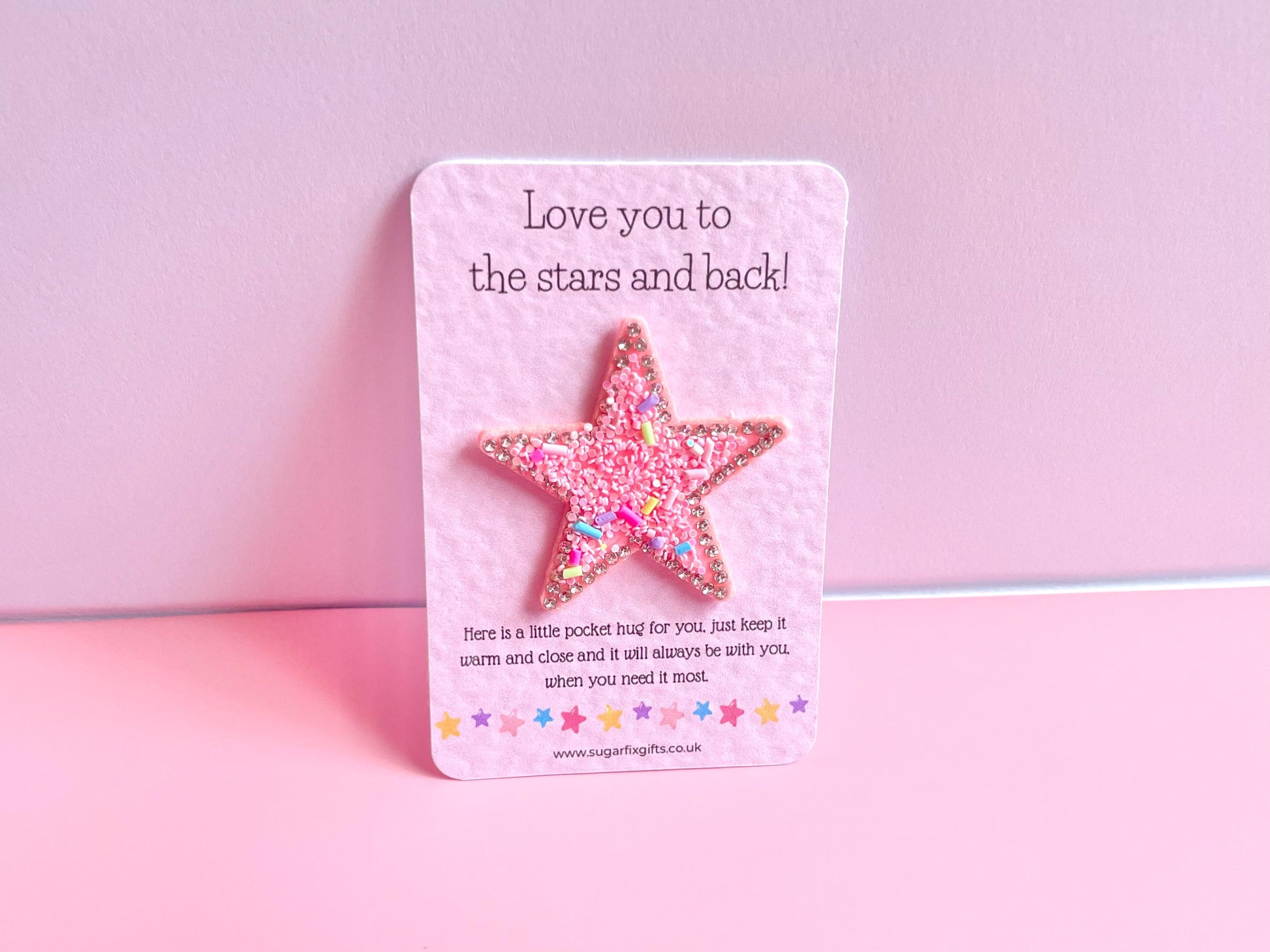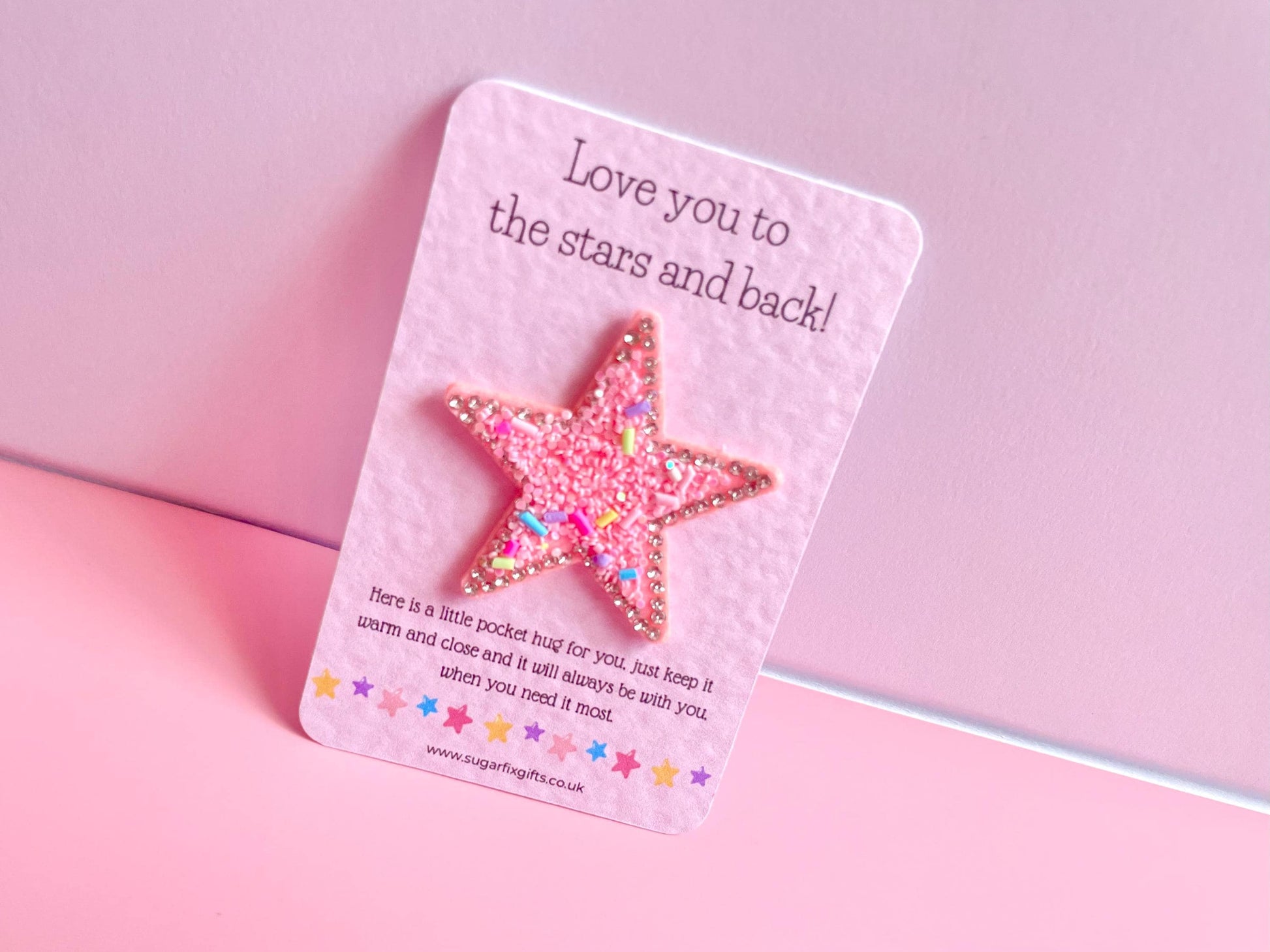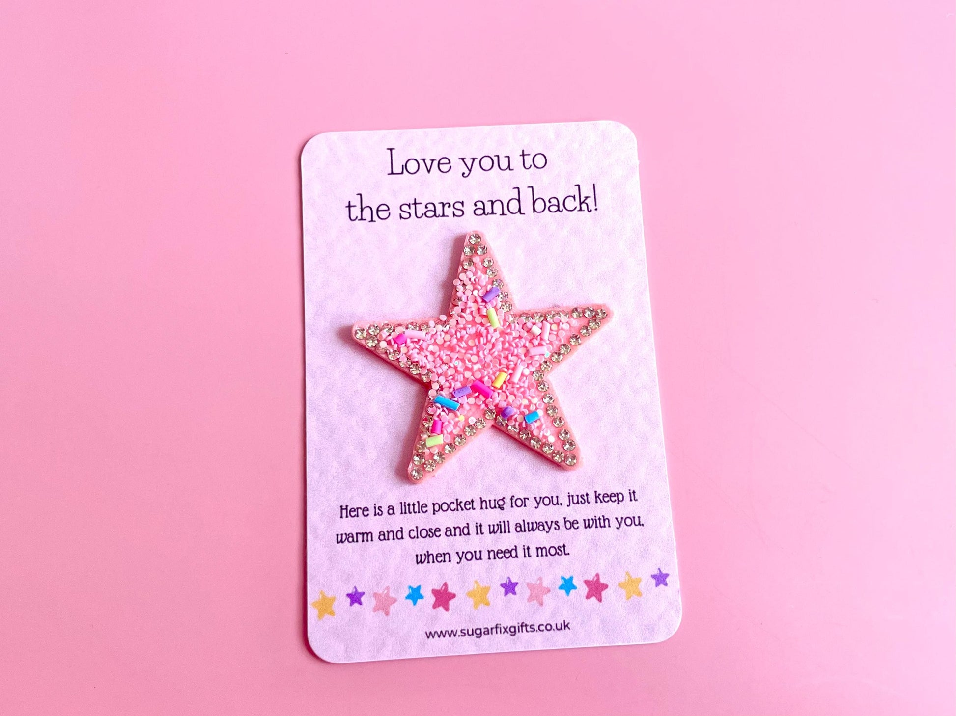 “Love you to the stars and back” Pocket Hug - Glittery Sparkly Star Shaped Pocket Hug - for someone who needs to know they are loved or you want to tell them how much you love them, great anxiety gift and perfect one to put in their pocket either with or without the card.