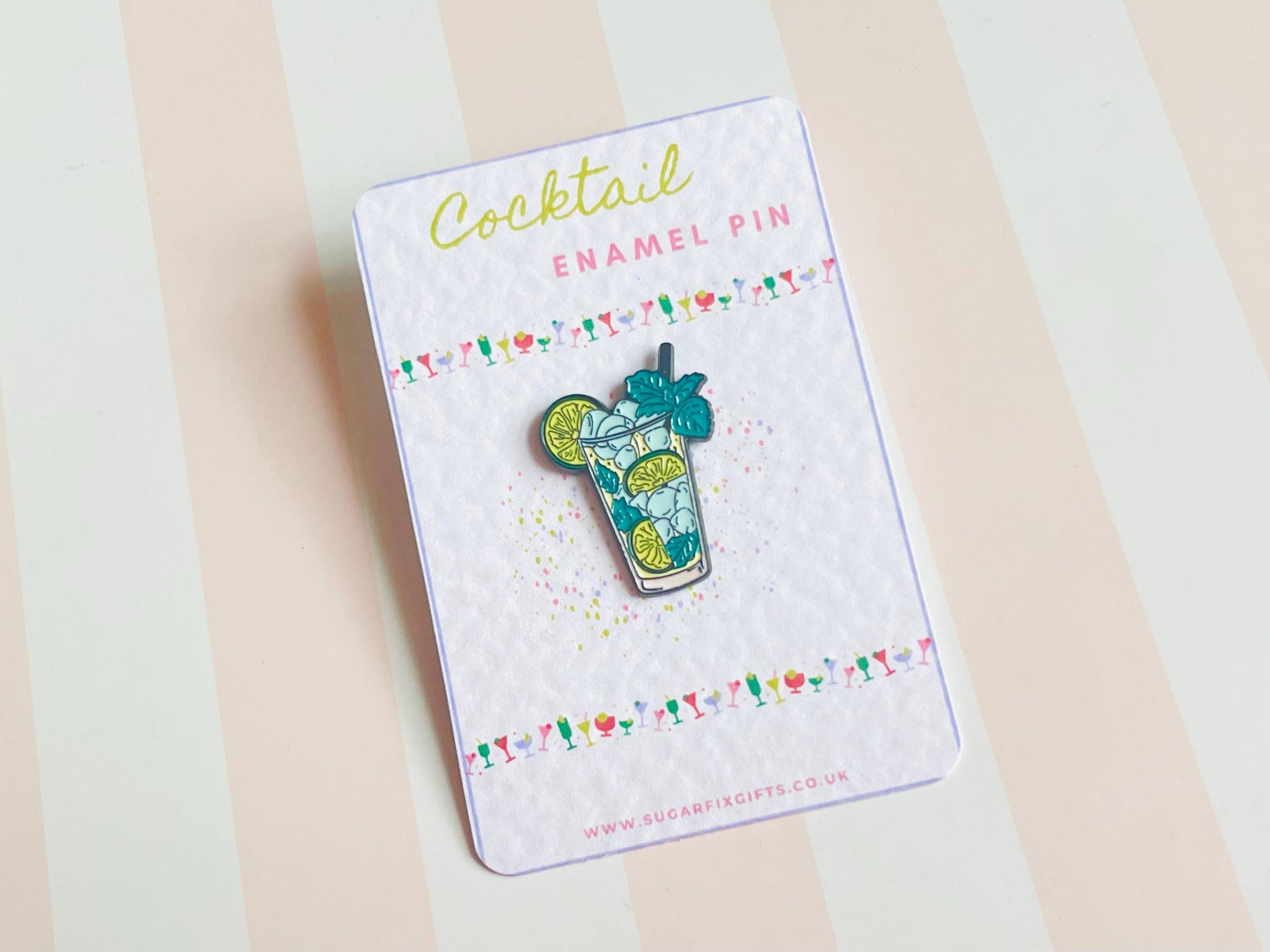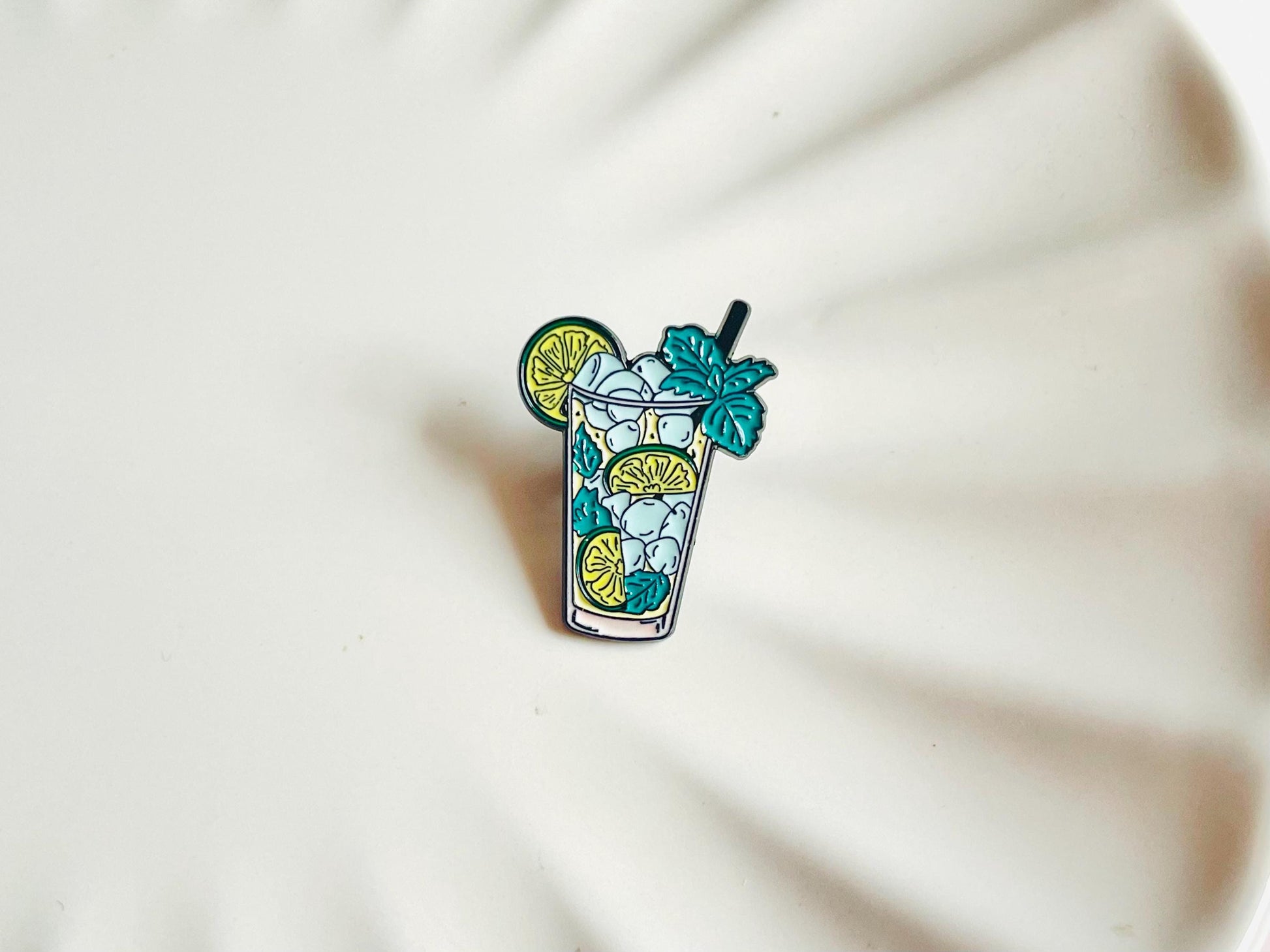 Mojito Cocktail Brooch Pin - perfect for someone who loves a cocktail - great gift for your friend - just a thoughtful gift or maybe a little adornment for your own jacket - presented on a lovely sentiment backing card and an organza bag is included. Made from enamel in a mix of green and yellow colour scheme - in a coordinating glass.