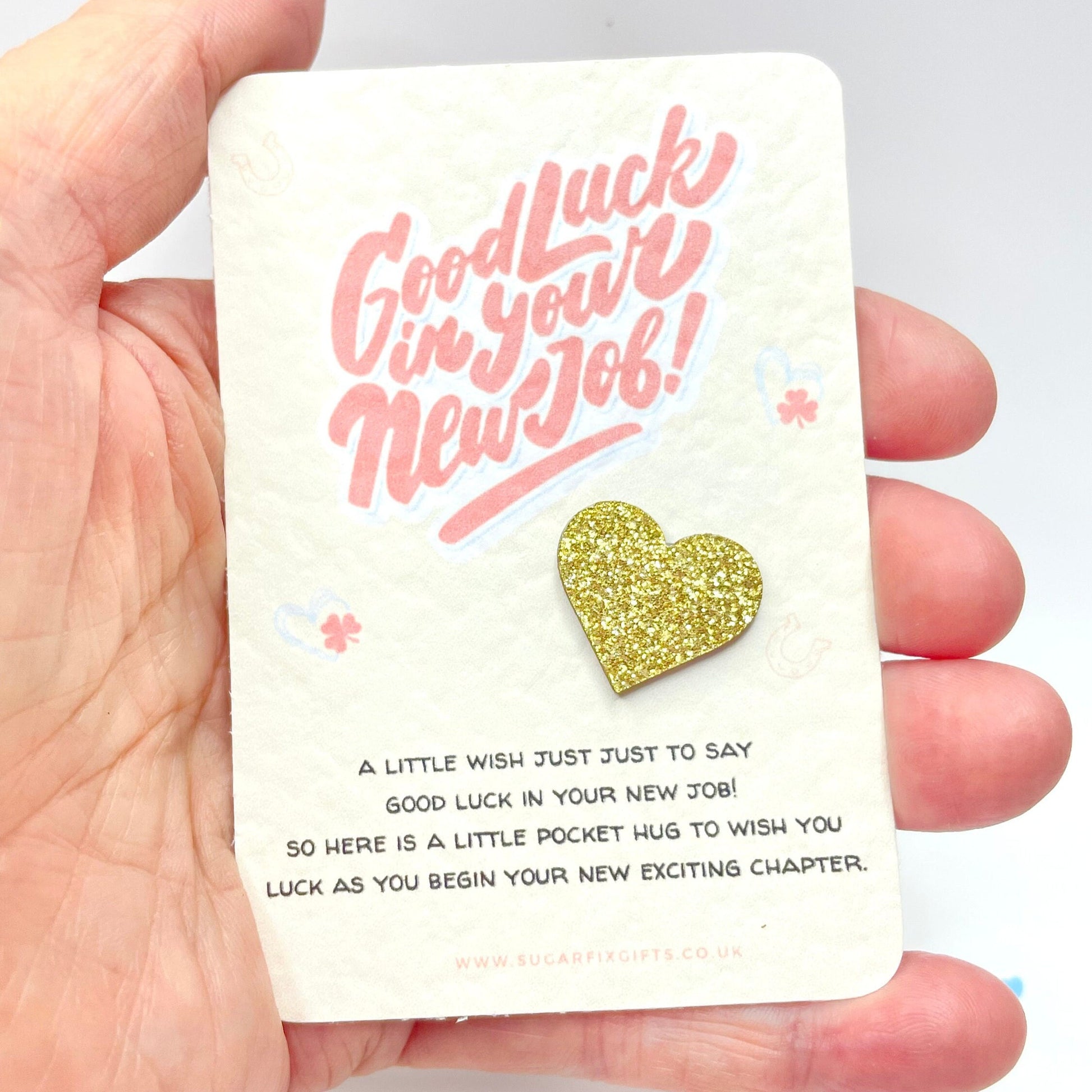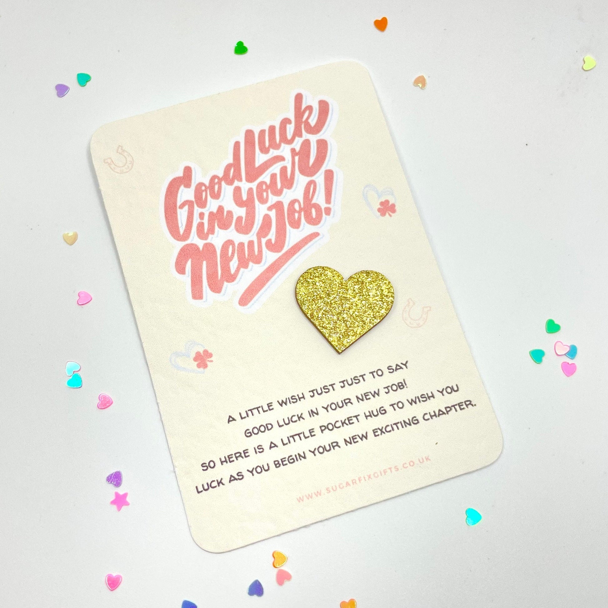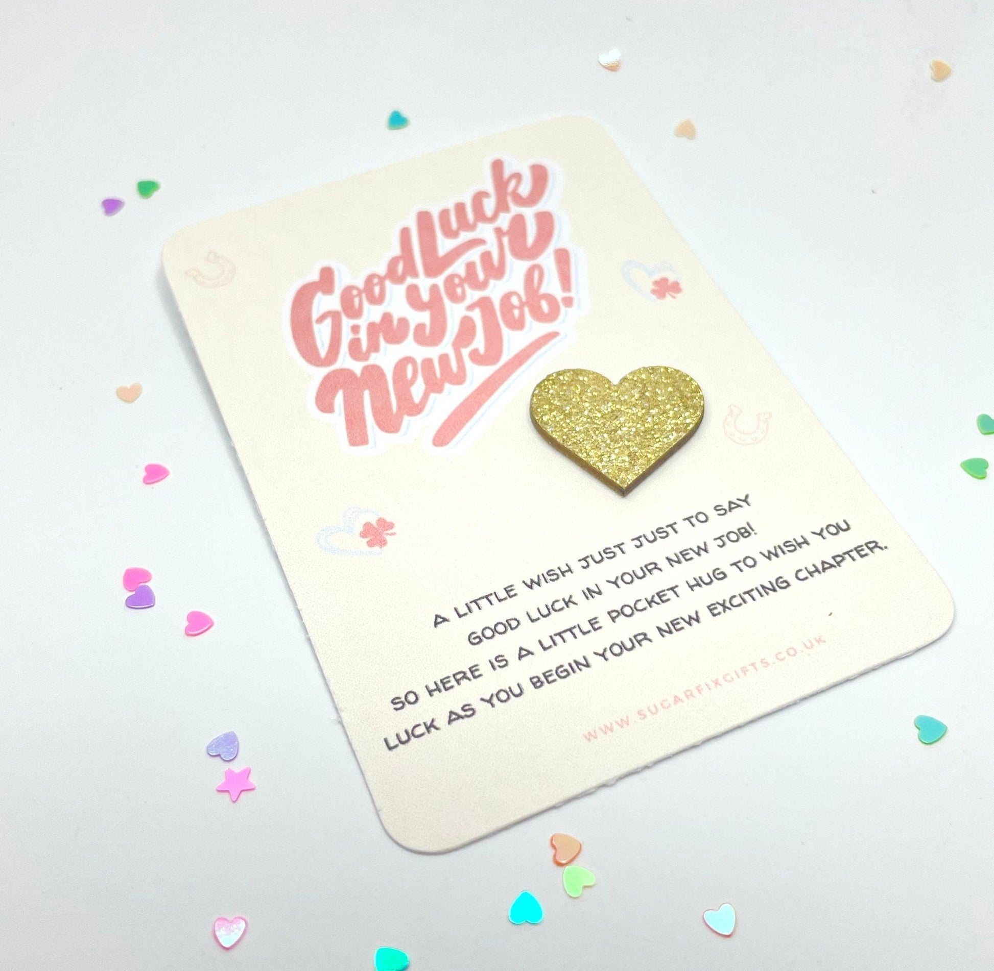 Good Luck in Your New Job Heart Pocket Hug with a handmade wooden heart covered in gold glitter with a lovely sentimental verse on a 300gsm card. Perfect as a keepsake token gift or slip into a greetings card.