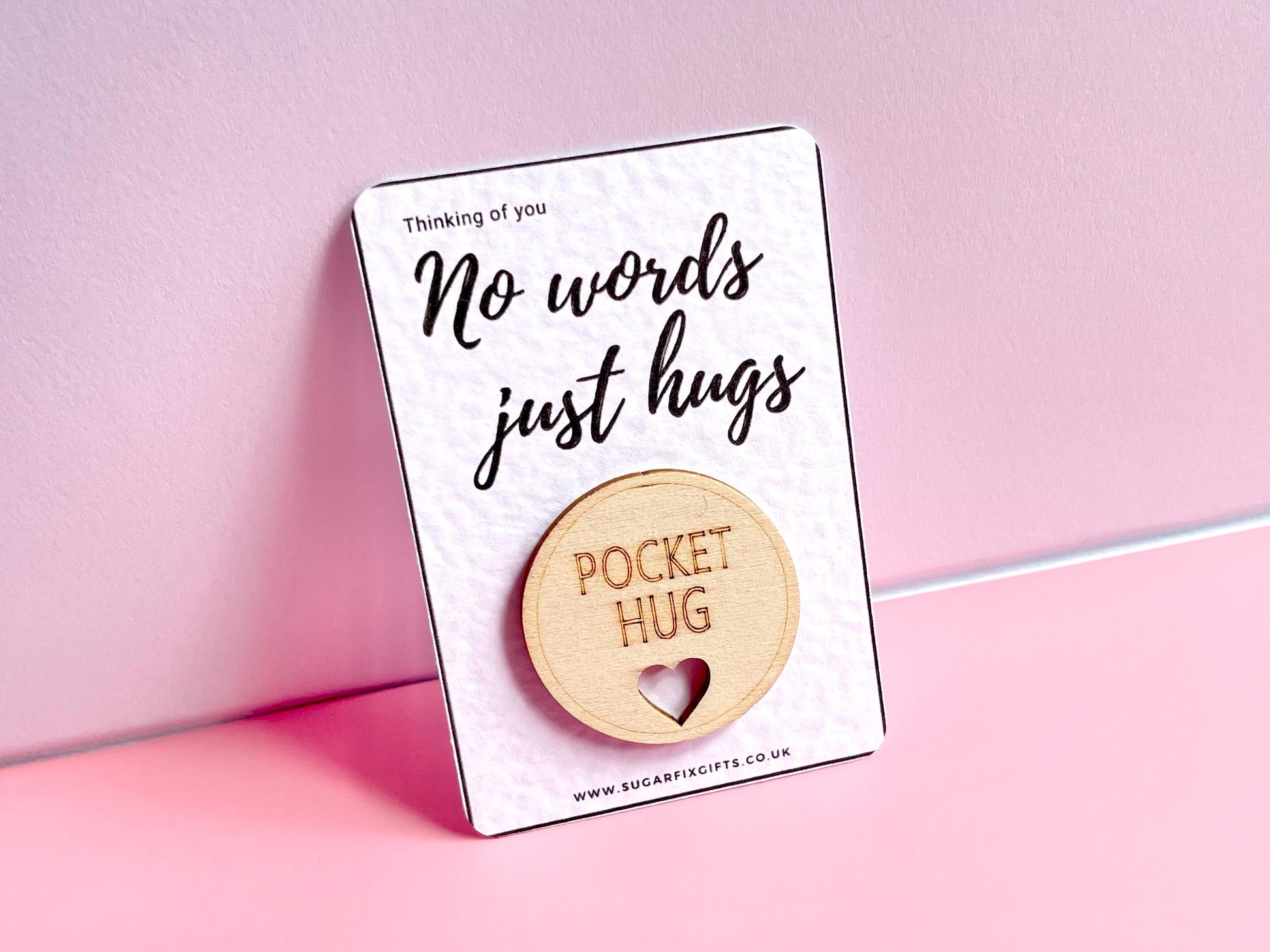 “No words just hugs” Pocket Hug - with a wooden round pocket hug and heart cut out - in bereavement it’s difficult to know what to say by sending this it tells that special person on your life that you are thinking of them and that you are there.
