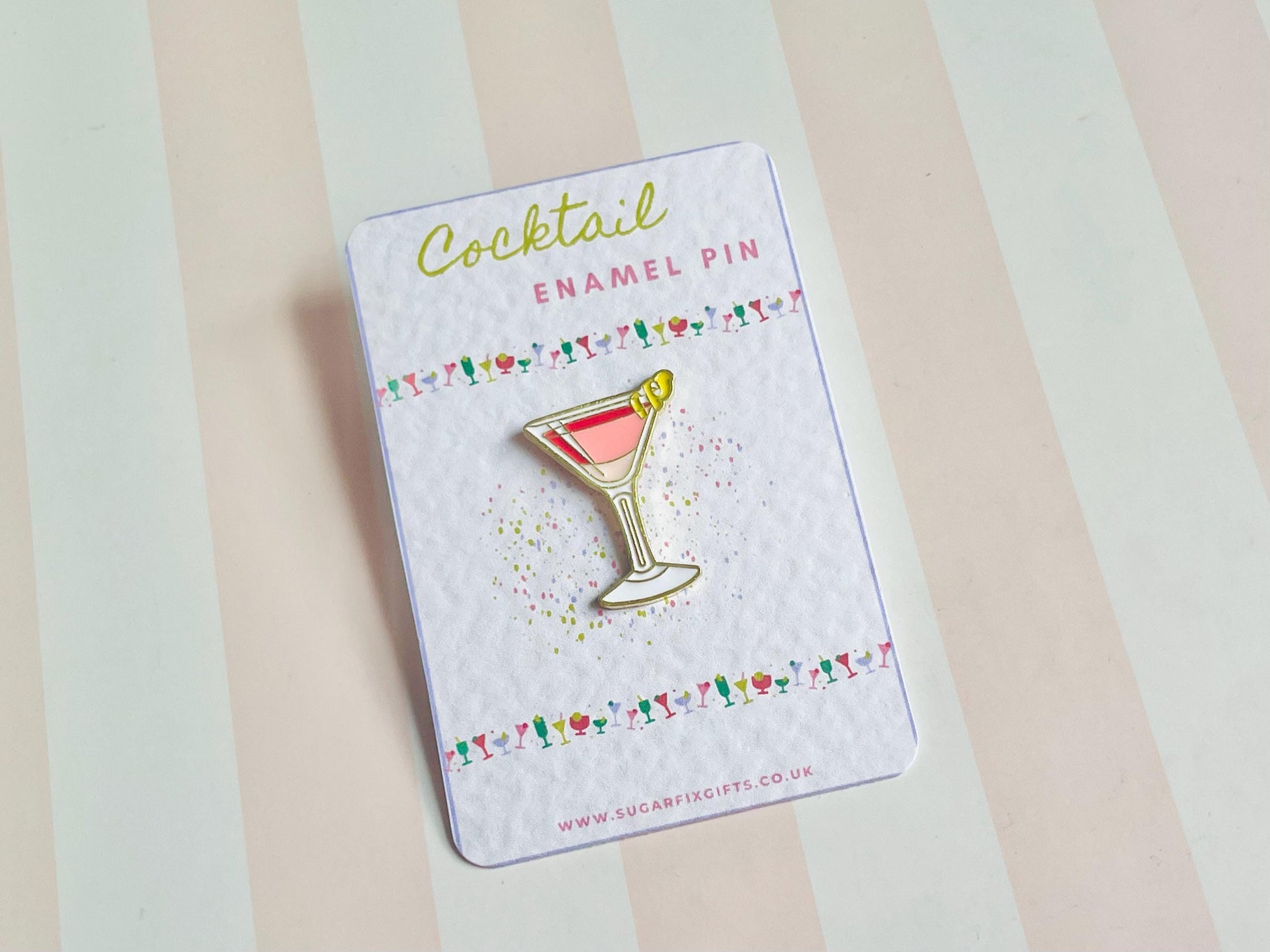 Pink Cocktail Brooch Pin - perfect for someone who loves a cocktail - great gift for your friend - just a thoughtful gift or maybe a little adornment for your own jacket - presented on a lovely sentiment backing card and an organza bag is included. Made from enamel in striking pink drink in a gold glass.