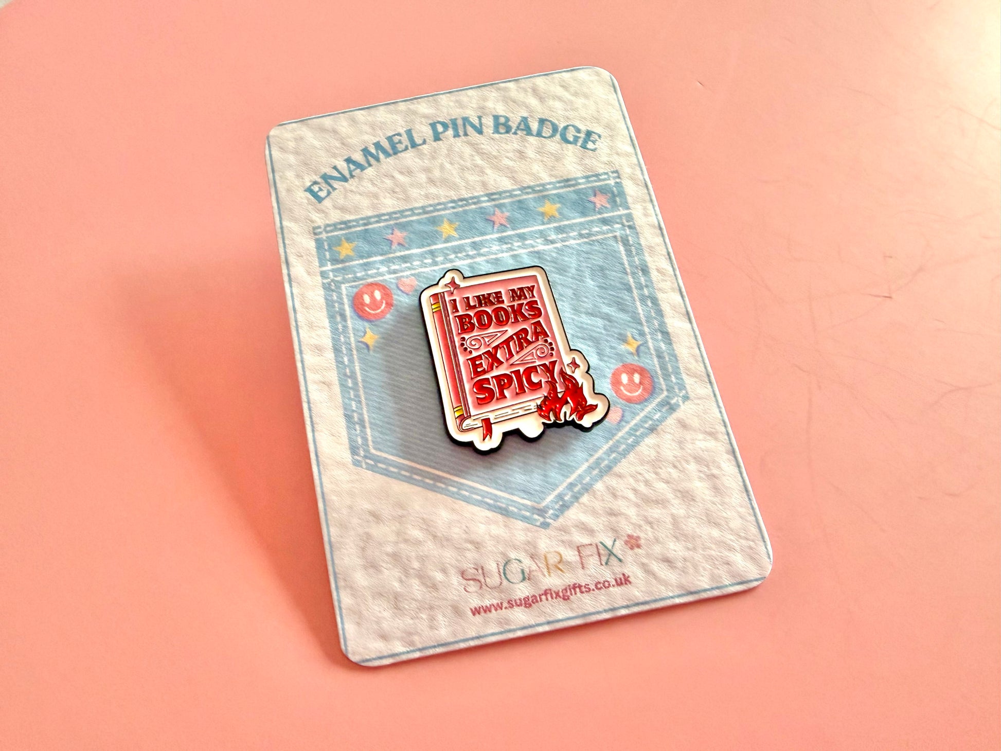 Pink “I Like My Books Extra Spicy” - Fun Slogan Pin Badge - perfect gift for your friend who loves reading or just a thoughtful gift or maybe a little adornment for your own jacket - presented on a lovely sentiment backing card and an organza bag is included.