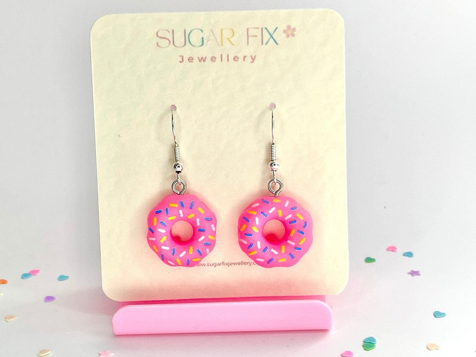Pink Icing Ring Doughnut Donut Dropper Earrings for pierced ears - made from resin and hung on 925 Sterling Silver ears wires.