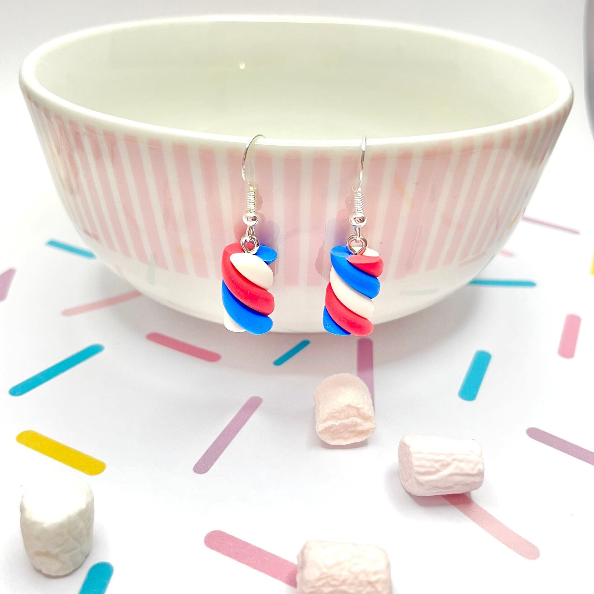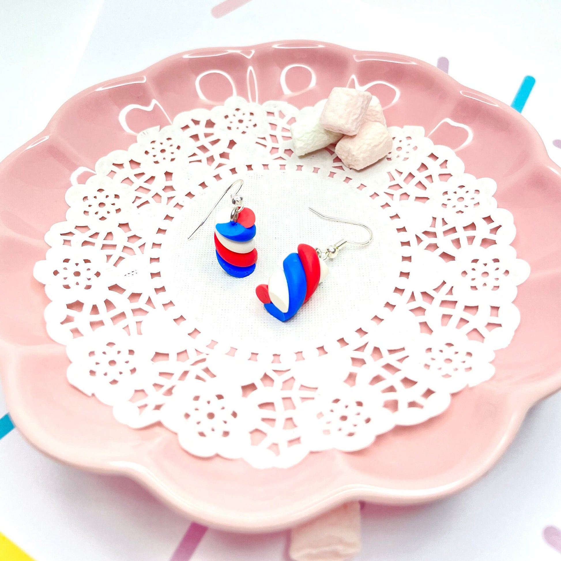 Flump Marshmallow dangle dropper Earrings for pierced ears - Lovingly Handmade with Fimo Polymer Clay hung on 925 Sterling Silver ear wires - in a mix of red, white and blue colourway. So cute and a perfect gift for any foodie!