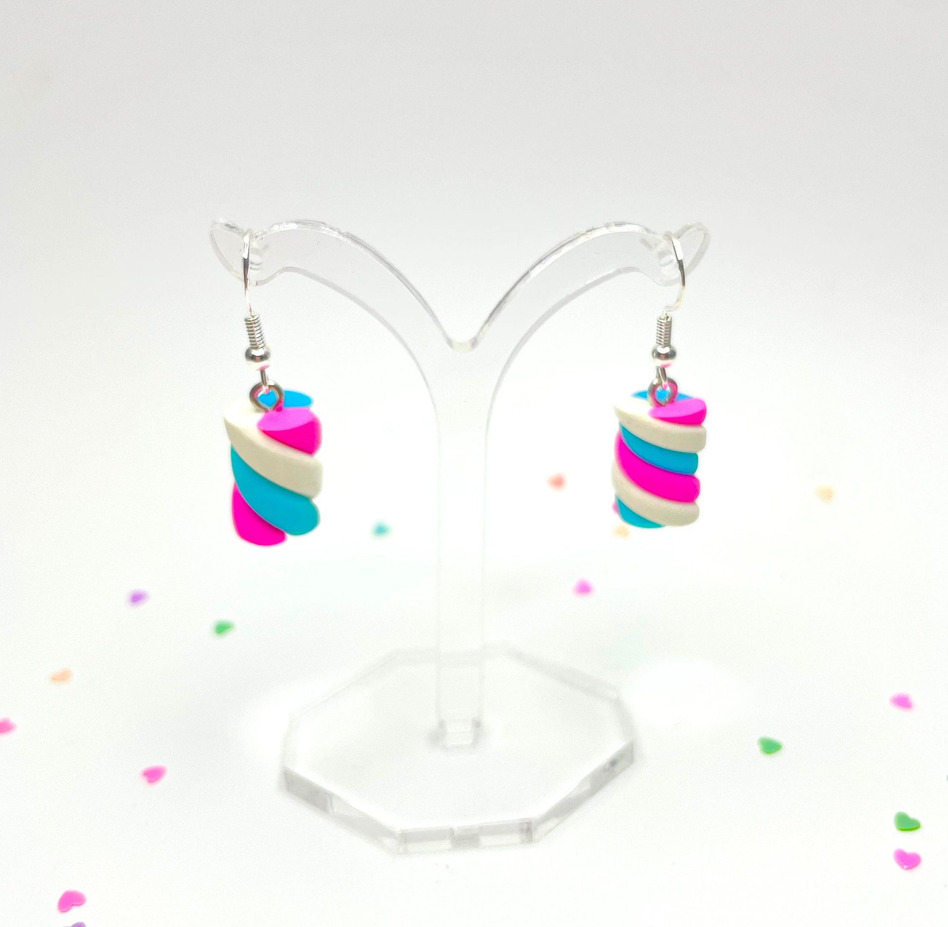Flump Marshmallow dangle dropper Earrings for pierced ears - Lovingly Handmade with Fimo Polymer Clay hung on 925 Sterling Silver ear wires - in pink, blue and white. So cute and a perfect gift for any foodie!