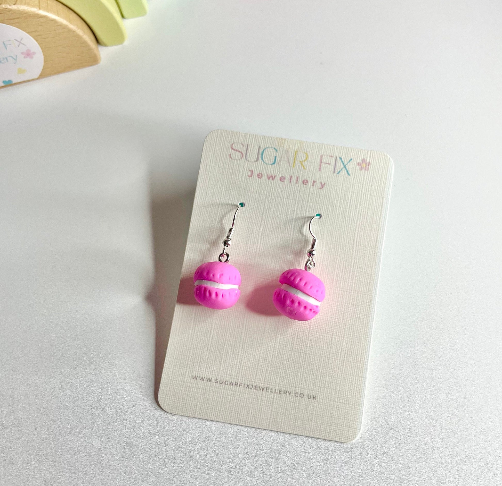Hot Pink Macaroon dangly dropper Earrings for pierced ears - made from polymer Fimo clay - hung on 925 Sterling Silver ear wires.