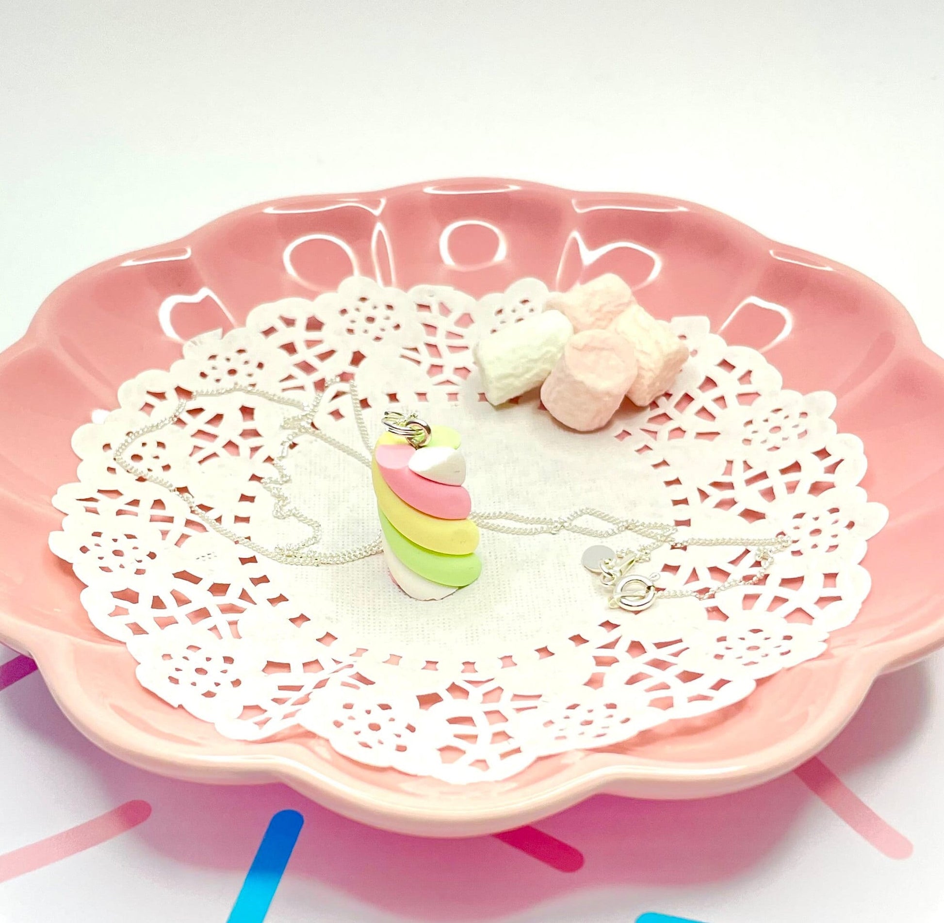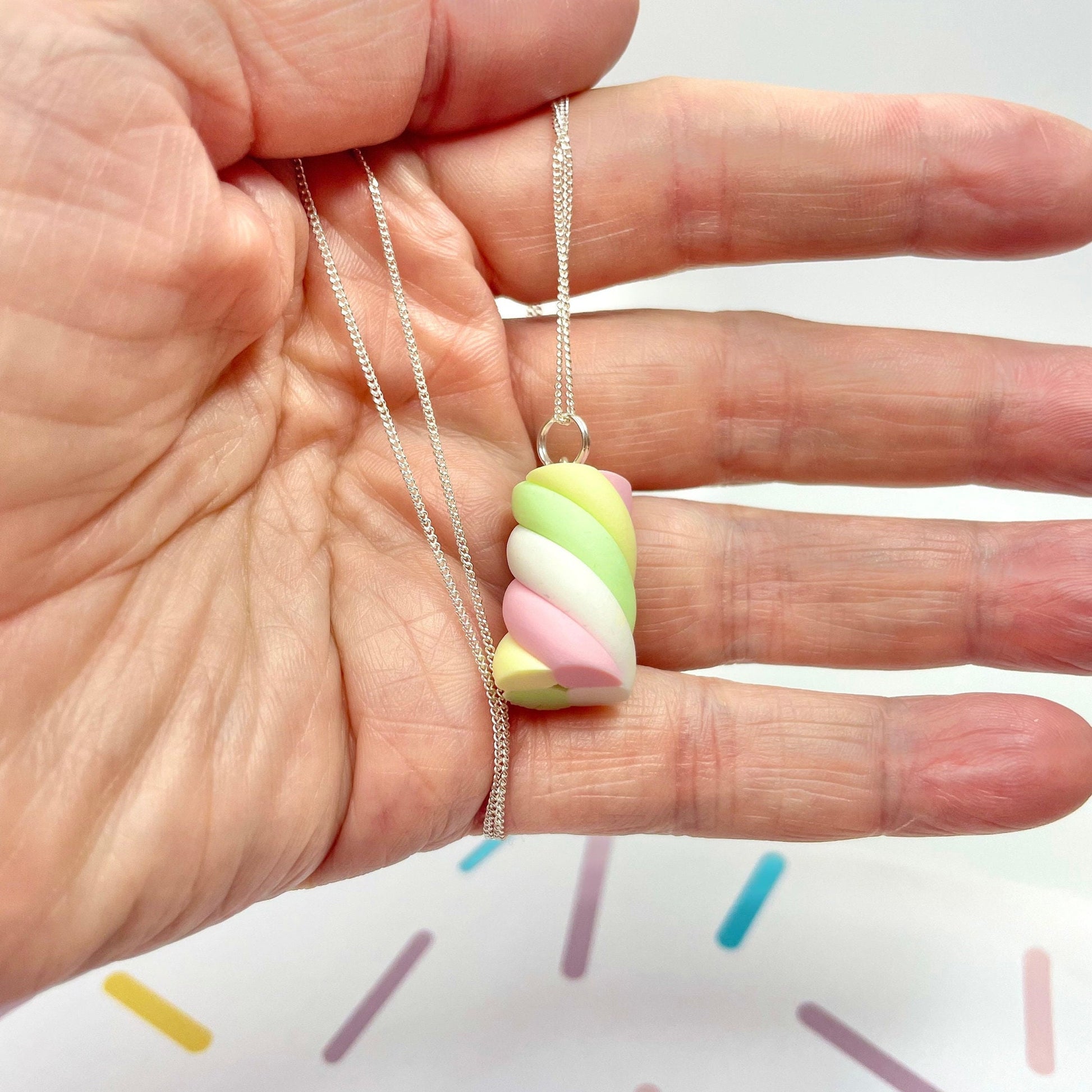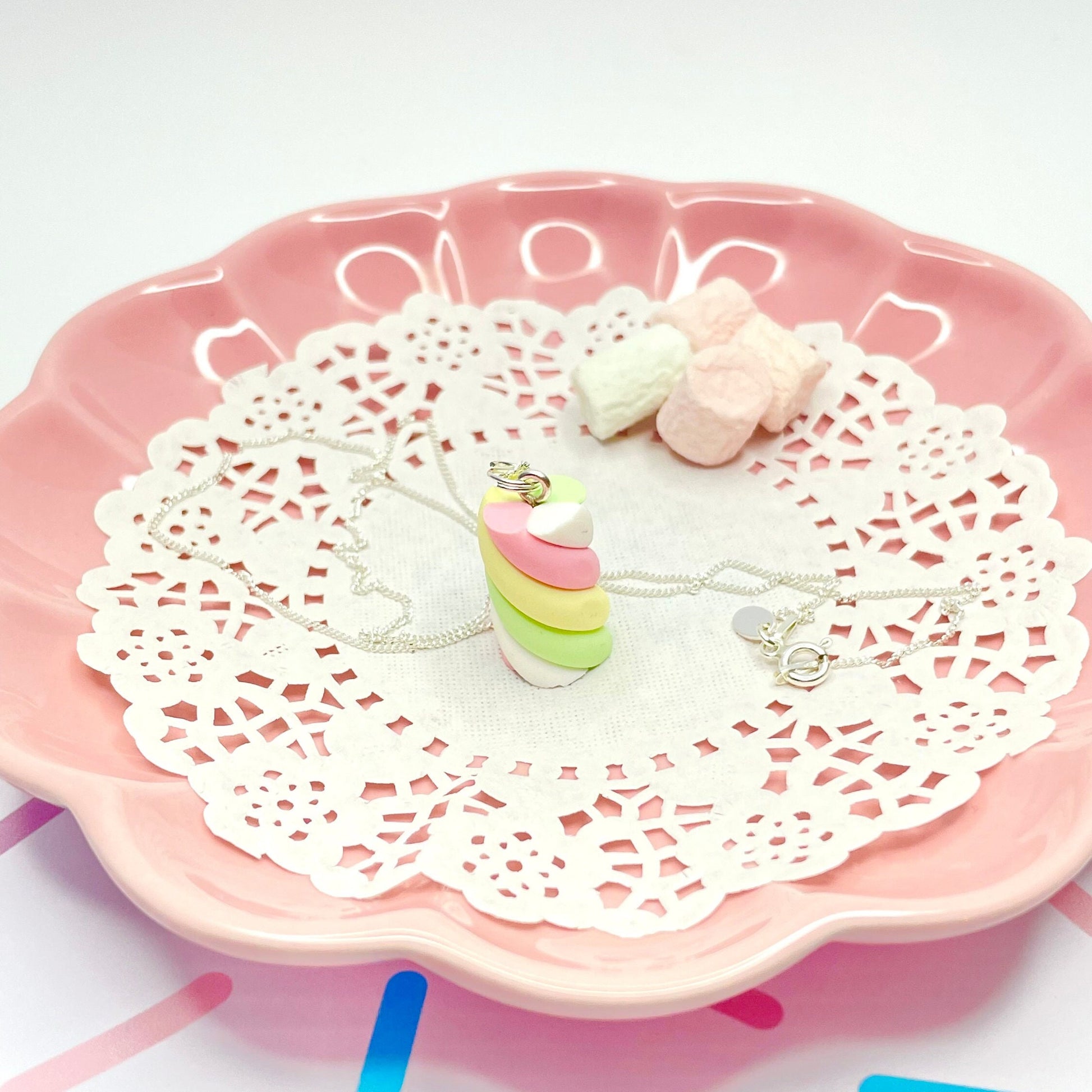 Little Pastel Marshmallow Flump Charm Pendant Necklace - Lovingly Handmade with polymer clay. Beautiful pastel colours of soft lemon, baby pink, mint green and white. So cute and delicate and a perfect gift for any marshmallow lover - how realistic is that? Hung on a delicate 925 Sterling Silver Curb Chain and Sterling Silver extender chain on various lengths.