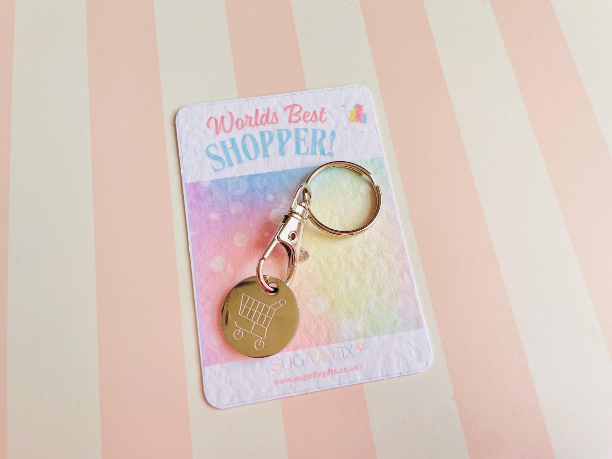 A perfect gift for The Worlds Best Shopper - a handy trolley coin on a key ring to attach to your keys or bag, the coin is thinner metal so it’s easier to remove from the lobster clasp - Made from metal with a flat back so it won’t take up too much room in a pocket.